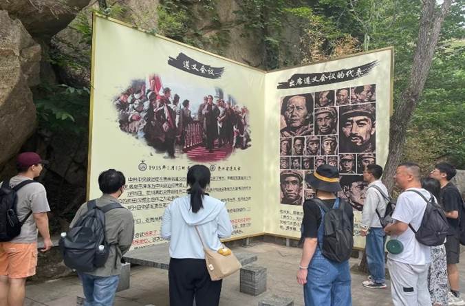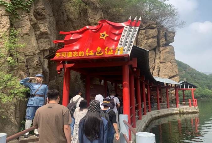 在青龙峡红色基地的党史教育长廊中,“血战湘江”,“遵义会议”,“四渡赤水”,“巧夺金沙江”……一幅幅长征的历史画面营造出的实景体验加上杜飞院长的讲解,让同学们脑海里关于这段历史的记忆仿佛活了过来,对我们党建立初期那段波澜壮阔的峥嵘岁月有了更加深刻认识,对我党革命先辈们将险峻五岭视为微波细浪,磅礴乌蒙山也作一颗泥丸的豪情,以及身处滔天浊浪的金沙、接天连地的山崖、凌空高悬的铁索时依旧乐开颜的自信从容的敬佩之情更甚之前。