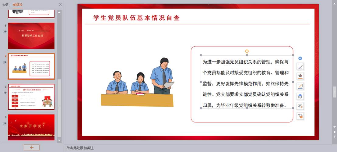 为进一步加强党员组织关系的管理,确保每个党员都能及时接受党组织的教育、管理和监督,更好发挥先锋模范作用,始终保持先进性。党支部要求支部党员确认党组织关系归属,为毕业年级党组织关系转移做准备。同时,面对即将到来的秋季学期,支委会着重“两个一百年”奋斗目标,统筹用好线上线下学习平台,制定了接下来的工作安排,力图带领党员同志们开展爱国主义主题教育活动,学思践悟、知行合一,切实用党的理论武装头脑。