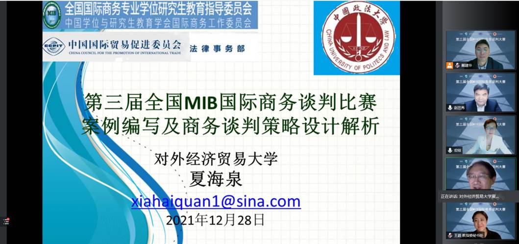 院务委员会主席、国际商务专业委员会会长、国际商务谈判教育资深专家夏海泉教授应邀,线上为来自全国各大高校的指导教师和参赛学生共计420余人次进行了赛前培训讲座。