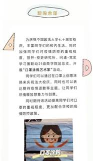 公众号发布多篇校园夏日探索系列推文、创办口罩涂鸦创意活动丰富同学们的在校生活,互帮互助之风心意虽小,却承载了共克时艰的满满爱意。学生党员牢记“战’疫’有我,有我必胜”的信念,贡献自己的力量。