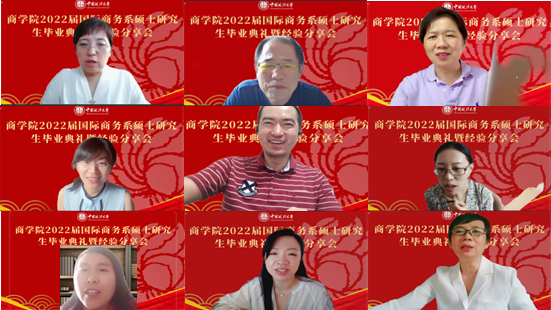 大家分享结束后各位老师纷纷送上自己的祝福,恭喜各位毕业生顺利毕业。金仁淑老师指出,步入社会更要懂得为人处事的原则,叮嘱大家在日后的工作中要敢于面对困难、抵挡诱惑,成为法大的骄傲;胡明老师寄语大家,要结合时代的需要和自己的兴趣,在社会工作中找准自己的定位,要志存高远同时要有将一件事情做到极致的专注,要不负时代,努力成就最好的自己;张淑静老师叮嘱大家,在工作中要多学多做多思,困难往往是一时的,在工作中遇到困难要有坚持下去的勇气,快乐成长,同时也要兼顾好个人生活;高秋明老师指出,在今后的工作中,大家也许会有迷茫,人生没有唯一正确的道路,要敢于探索和实践,走出自己的精彩,做一个正直的人;梁涵老师强调,大家步入社会要用实际行动践行爱国主义,在社会工作中体会民主科学的含义,在工作中做到尊重前辈、多学多做;张硕老师鼓励大家在以后的社会工作中遇到困难要勇于跳出迷茫,不忘初心用一颗恒心去坚持自己最初追寻的目标和理想;杨丽花老师祝福大家工作进步的同时,生活顺利美满,嘱咐大家以后工作累的时候常回国际商务系这个大家庭看看。此外,研究生办公室主任郑晓燕老师,与同学们朝夕相处的研究生办公室燕都老师、叶青老师也纷纷向各位毕业生送上祝福,同学们感谢几位老师为大家的付出。2020级硕士研究生李芃、常志远,2021级硕士研究生鲁子弘、龙翀分别就自己听了师兄师姐的经验分享和老师的寄语后谈了自己的感想。