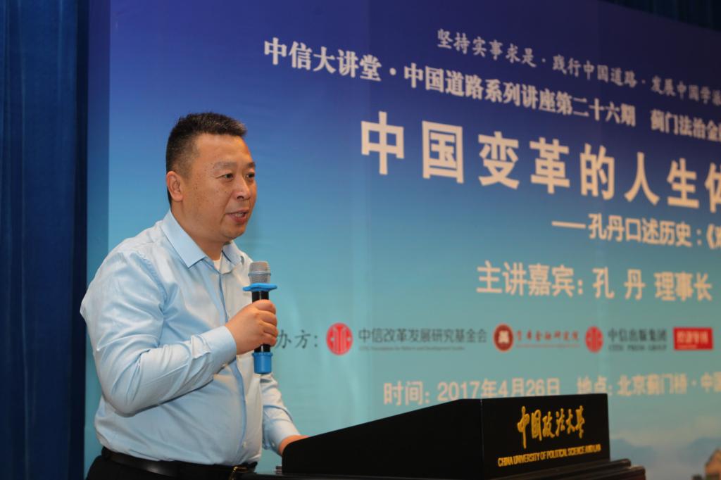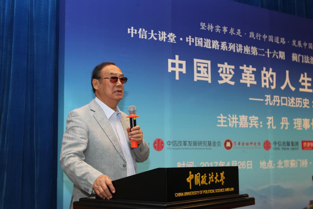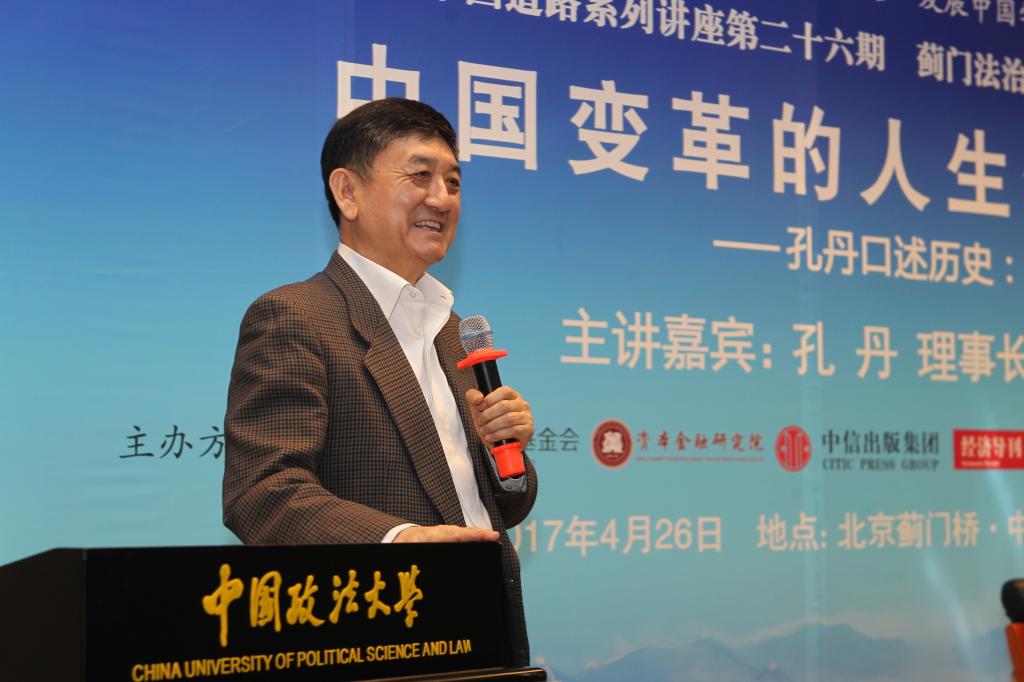 时建中在致辞中说孔丹理事长的人生经历非常丰富,是个有故事的人,过去有故事,并且现在故事依然精彩的人,概括起来是12个字“强烈反差、巨大成功、深度思考”。他30岁出头便经历了新中国改革开放以前的社会,之后又是我国改革开放过程和进程的亲历者、实践者和思考者。可以说孔丹理事长是一位又红又专的前辈,中国政法大学是一所又红又专的大学,一个又红又专的人来到又红又专的大学,进行个人的口述,这是多么令人期待。