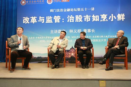 在随后的圆桌讨论中,全国政协委员、中央财经大学证券期货研究所所长贺强、北京工商大学证券期货研究所所长胡俞越就本次探讨主题与林义相、刘纪鹏展开交流探讨。