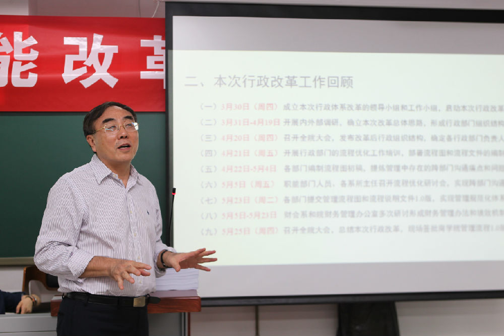 行政职能改革工作发表总结报告。刘院长首先对此次行政改革工作进行了全面回顾,3月30日行政体系改革领导小组和工作小组成立,行政体系改革正式启动。本次行政体系改革的目的在于构建权责有序的组织体系,梳理高效运转的管理流程,确立规范合理的财务体系,明确奖惩分明的绩效机制。在行政体系改革领导小组的指导下,凤凰彩票