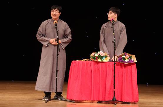 随后,中国政法大学曲艺团的两位同学带来了《歪唱太平歌词》,通过对《太平歌词》新奇出彩的改编,表演者们在展示自己扎实的基本功的同时,也给大家带来了许多包袱笑料,逗乐全场。