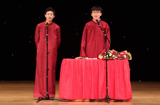 在一片掌声中,中央财经大学逗你玩儿相声社带来的相声《lsy家族》,相声以诙谐幽默的方式,穿插着同学们熟悉的游戏、流行用语等,妙语连珠,现场笑声不断。