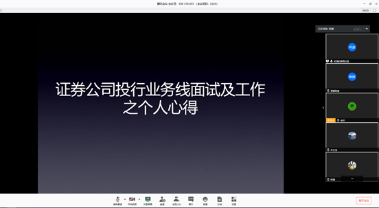 首先,17级学硕校友何渊热情分享了自己一路的实习和求职经历,尤其是在投行业务为同学们进行了详细的介绍,投行到底做什么,简历和面试应该注意的细节,投行面试有哪些技巧,实习一定要抱着多学习的心态,而非刷简历的心态,多干活多思考。如果在这个实习中学不到内容,就赶紧放弃,大学时间真的非常宝贵。工作是论文答辩的另一种形式,在工作中容错空间更大。读书及论文是方法论或者战略层面的学习和训练,对世界可以有更深刻的理解和思考。工作的过程本身就是匹配需求和供给,没通过说明两方不匹配,并不代表自己不优秀,做到最好的自己。实习是战术层面的学习和训练,不如读书来的深刻,但是确实日常工作中非常需要的。结论:既要读书又要实习。选择工作的心得体会,最好选择大平台但是也要放平心态。