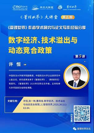 应《管理世界》编辑部邀请,我院法商管理系许恒副教授在《管理世界》大讲堂2021年第五期第五讲分享发表于《管理世界》2020年第11期的论文《数字经济、技术溢出与动态竞合政策》(作者:许恒、张一林、曹雨佳)。本文通过考察数字经济对传统经济的技术溢出和技术冲击两种效应,提出构建一种短期性的竞争缓冲机制——“竞合型”政策,适度强化数字经济的技术溢出效应,但这并非保护落后产业或阻碍竞争,而是为了促进传统经济转型升级并与数字经济保持持续的竞争,以竞争为抓手维护消费者利益和提升社会总福利水平。