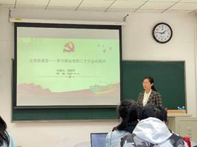 2022年11月4日,在中国政法大学昌平校区,经济学党支部司海平老师把学习领会“党的二十大精神”融入本科生《中级微观经济学》课堂,结合课程内容带领2021级经济学专业的同学们共同学习党的二十大报告。