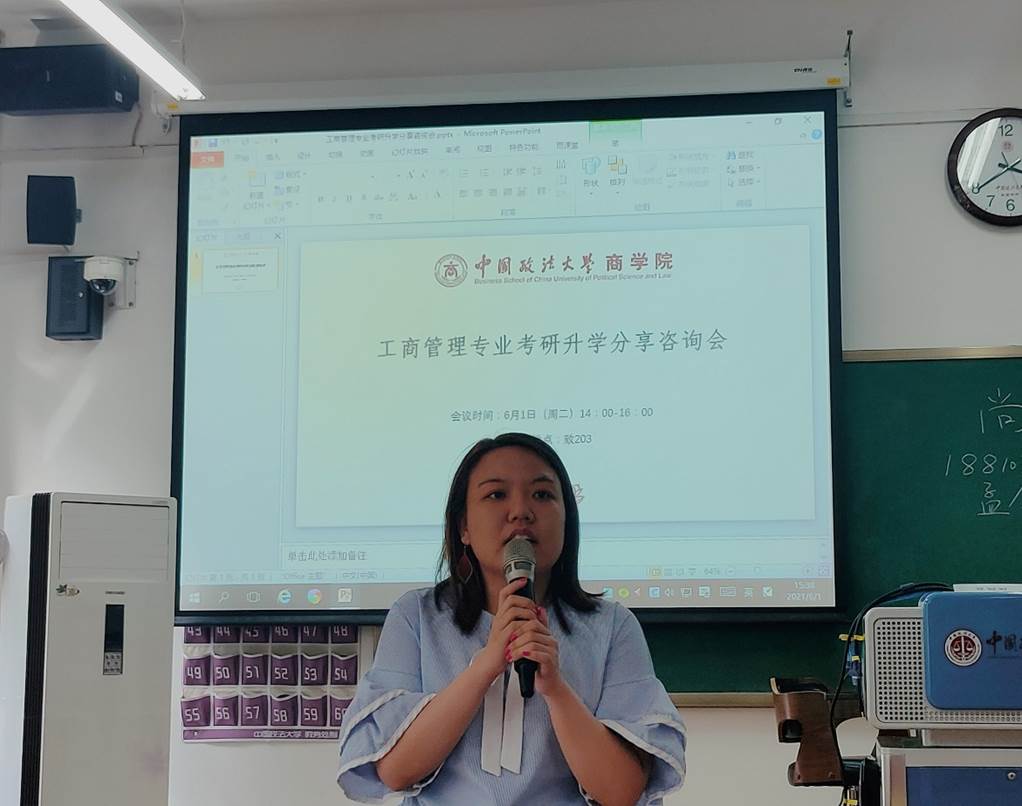 2021年6月1日下午,工商管理专业考研升学分享咨询会在昌平校区致公楼203教室顺利召开。参与分享会的有工商管理系主任郭颖老师、法商管理系副主任孟令星老师、财务会计系张美玲老师、企业管理系李璨老师、双学士辅导员贾娜琳捷老师、2018级辅导员郑益群老师、2018级会计学硕士生钱晨同学、2020级企业管理专业硕士生王明星同学以及2018级、2019级和2020级工商管理专业的在校本科生。