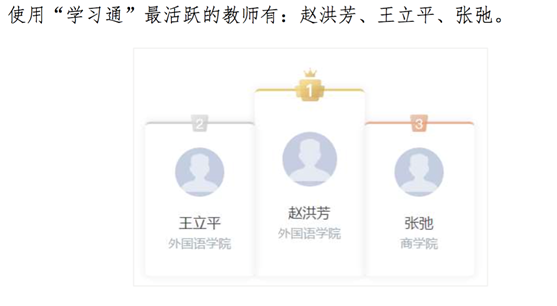 成绩的背后凝结着全院教师辛劳付出!前四周,我院师生活跃度、上传学习通的教学资源均在全校排名中位列第一。第二周,王玲教授、张美玲副教授分别在“使用学习通最活跃的老师”排名全校第二和第三名。第三周,张弛副教授在“使用学习通最活跃的老师”排名全校第一名。第五周我院的张弛老师依然位列“全校使用学习通最活跃的教师”前三名。向疫情期间为教学付出的每一位老师致敬!