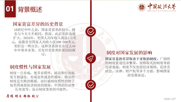 本次同学们的汇报内容主要分为三部分。第一部分是对本书基本内容的背景概述;第二部分是书中主要内容介绍,主要从制度决定国家贫富、制度差异如何产生、制度如何延续三个方面进行阐述;第三部分本书内容总结。