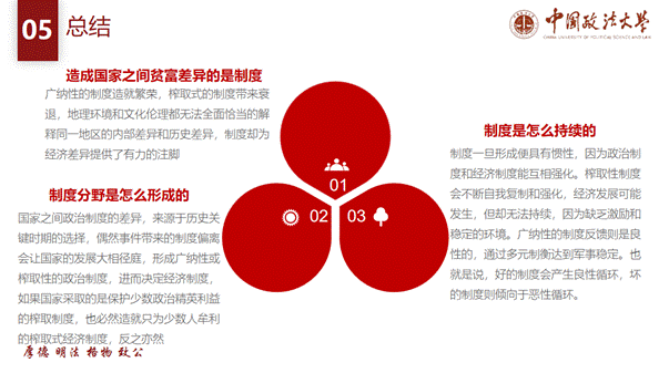 第三部分,税国楠同学对本书的内容进行了总结。本书认为,经济与政治制度决定国家的贫富,包容性的制度造就繁荣,而榨取式的制度带来衰退。国家之间政治制度的差异来源于历史关键时期的选择,偶然事件带来的制度偏离会让国家的发展大相径庭。而制度一旦形成变具有惯性,因为政治制度和经济制度能互相强化。榨取性制度会不断自我复制和强化;包容性的制度反馈则是良性的,通过多元制衡达到军事的稳定。最后税国楠同学指出,书中对于贫困国家如何摆脱经济失败现状没有提出建设性的方案或意见。