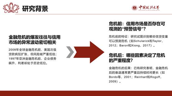 李妍萱同学在第一部分汇报中说明金融危机的爆发往往与信用市场的异常波动密切相关。由此引出文章研究的两个核心问题:危机前:信用市场是否存在可观测的“预警信号”?危机后:哪些因素决定了危机的严重程度?