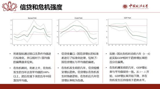 杨正同学重点分析了金融危机及其后果。首先就信贷、利差和产出数据的初步情况进行了介绍。在危机期间,利差上升,在危机发生的当年利差达到平均值的100%以上,然后在接下来的五年中回落到平均值;信贷规模在危机发生前呈增长趋势,在危机发生时急剧逆转,危机后转为负值;GDP在危机发生后长期低迷。