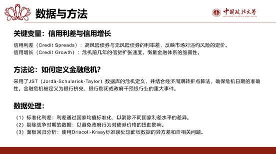 随后,李妍萱同学还介绍了文章的数据来源、关键变量、方法论和数据处理方法,并指出研究的核心创新在于数据——文章收集了17个国家从1869年至今的信用利差数据。这种长周期、跨国别的数据,让作者能够捕捉到不同时代、不同经济体制下金融危机的共性。