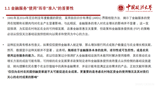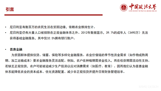 随后,蒋晓萌同学还介绍了尼日利亚普惠金融相关情况,尼日利亚为了能够提升低收入家庭的经济增长,普惠金融需贯穿农业价值链的各个环节。然而,普惠金融对农业的具体影响仍存在争议。现有文献中,若干关键问题尚未得到充分探讨。例如,此前研究均未系统分析金融服务的使用对农业在短期或长期内是否具有显著影响。此外,蒋同学还提到,这篇研究对于该方面的空白进行了填补。