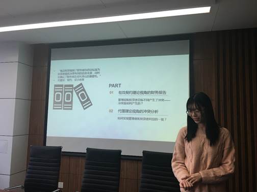 钱晨同学的汇报从两个部分展开:一是有效契约理论视角的财务报告,二是代理理论视角的冲突分析。在第一部分中,钱晨同学详细介绍了有效契约的概念、有效契约需求的来源、有效契约的会计政策以及雇员股票期权等内容。其中,她重点阐述了管理层和投资者二者间的目标冲突,并分析了财务报告在解决目标冲突中的作用。在第二部分中,钱晨同学重点运用代理理论分析了用来联合所有者和管理者利益的常用方式。