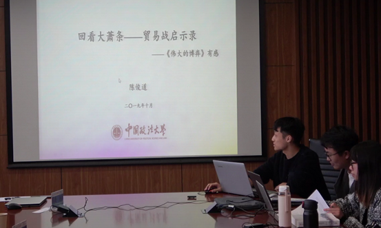 资本金融系第八期读书研讨会在科研楼B215会议室举行。出席本次活动的有资本金融系主任程碧波副教授、系副主任成福蕊副教授、朱晓武教授、胡历芳老师、黄聪老师以及2019级金融学、金融专硕研究生。本次读书会的分享书目是约翰·S·戈登的著作——《伟大的博弈》,由曾泓叡、刘胜、陈俊道同学进行读书分享。
