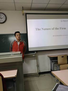 谢文成同学报告的是科斯的《企业的性质》。他从经济学家对企业的不同理解、企业出现的原因、企业的规模、结论的正确性证明和理论对现实的解释力五部分分别进行介绍。在讲解过程中谢文成不断地提出问题启发大家思考,也不断提出自己的疑惑供大家探讨。