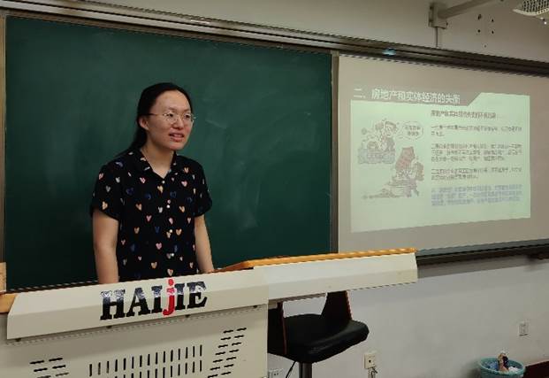 欧文潇同学主要介绍了“房地产和实体经济的失衡”、“建立房地产调控的长效机制”等部分,她提出“深房理”炒房事件的发生反映出实体经济脱实向虚的问题。她认为,面对今后房地产市场的发展趋势,政府应建立市场化、法制化的调控机制。