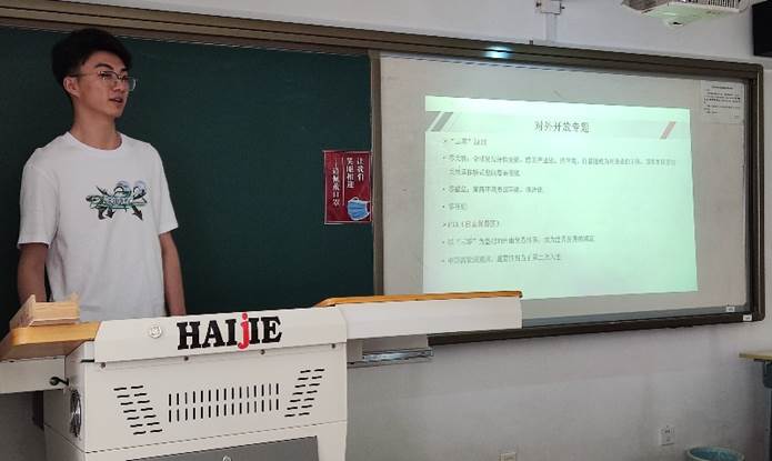 高硕同学主要向大家介绍了“对外开放”、“中美贸易”、“对外开放与中国经贸”等部分,他提出美国缺乏继续以关税作为主导工具的利益动机,贸易战的形式将不会在中美的全面战略竞争中占据主导地位;中美贸易战是一个持久战,不可能在一代人中得以解决;中美经贸前景广阔,合作仍是主流。
