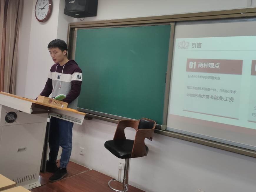 马慧博同学首先对论文的整体框架以及论文的结论进行了详细的介绍。同时她联系理论和现实,将自动化对职业的影响进行了划分,提出了“所需社交能力和决策能力越弱的职业越容易被替代”的观点。