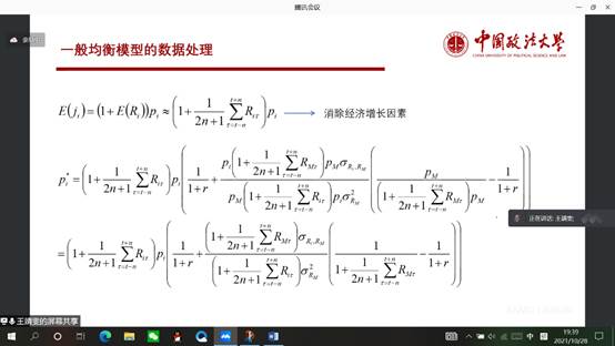 三位同学发言结束后,程碧波老师、洪智武老师先后做了点评和指导,并针对历史收益率的选择等相关问题做了精彩的讨论研究。程碧波老师为同学们讲解了一般均衡模型中市场参数的由来,用严谨的数理推导得出参数的表达式并且给出式子背后的经济学含义。