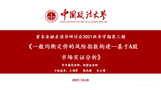 资本金融系第三期金融学读书研讨会通过腾讯会议在线上成功举行。参加本次读书研讨会的有程碧波老师、洪智武老师、李大夜老师以及2021级金融学硕、金融专硕的同学,以程碧波老师推荐的《一般均衡定价的风险指数构建—基于A股市场实证分析》为研读文献,2021级金融学硕朱文晴、王靖雯、杨忠捷三位同学为本次读书会的主讲。