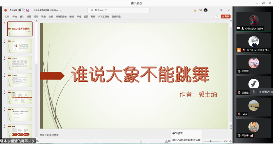 工商管理系、工商管理党支部研究生第24期读书研讨会于2021年12月28日上午以腾讯会议的方式顺利举行。本次读书会由张亚琼老师主持,2020级企业管理硕士生李世清同学主讲。参与本次读书会的有工商管理系郭颖老师、王玲老师、于淼老师、邵开愚老师、李璨老师及2020级、2021级企业管理全体研究生,大家围绕邓晓老师推荐的《谁说大象不能跳舞?》一书的内容及相关问题展开了讨论。