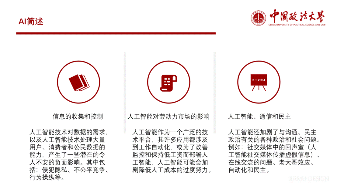接下来李琛介绍AI并讨论了当前人工智能技术发展道路的几个潜在的经济、政治和社会成本。并指出如果人工智能继续沿着目前的轨迹部署,并继续不受监管,它可能会产生各种社会、经济和政治危害。这些问题包括:损害竞争、消费者隐私和消费者选择;工作过度自动化,加剧不平等,低效率地压低工资,未能提高工人生产率,分享了人工智能与劳动力市场,数据操纵,并具体描述了在生活中的体现和发展动态。