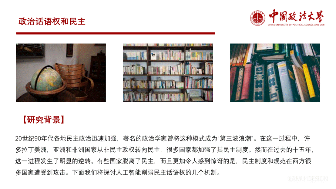 紧接着,张晶同学主要是从人工智能与民主这个角度展开,AI对于数据垄断形成一种隐形的威胁,还有破坏性的政治话语,这是民主最基本的命脉。这正是因为人工智能的前景和广泛的潜力这些成本并不是人工智能技术本身固有的,而是与它们目前的使用和开发方式有关——让企业和政府有能力对抗工人和公民。因此,限制和扭转这些成本的努力可能需要依靠监管和政策来改变人工智能研究的方向。仅仅通过促进竞争来遏制它们可能是不够的。