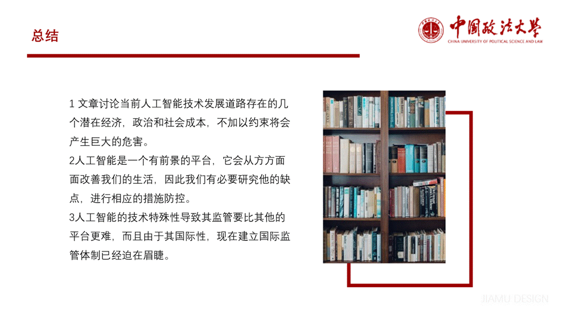 最后,李琛同学给大家做了总结。由于AI发展的一些社会成本,为了防止这些成本的最好方法是监管人工智能,引导人工智能研究,远离这些有害的努力,转向人工智能能够创造新任务、提高人类生产率的领域,以及能够赋予工人和公民权力的新产品和算法,最后,他阐释了该AI对现实的影响以及对AI发展构想。