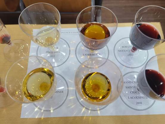 此次《红酒与金融》课程,董中奇博士不仅介绍了法国葡萄酒发展的历史和相关知识,还带来了多种葡萄酒,让同学亲身体会不同葡萄酒差异。品酒列表包括:法国AOP级别酒、法国阿尔萨斯白葡萄酒、西班牙无醇、意大利气泡酒。除此之外,董中奇博士还特意带来了私藏的法国波尔多列级名庄两年份来对比品鉴。董中奇博士向同学们介绍每一款酒的口感、历史,引导大家通过“看色”、“闻香“、“尝味”细细品味酒体、酸甜度、果性,感受每款酒独特的风味,一时间,教室弥漫着淡淡的醉人香气,现场的同学积极向老师提出关于红酒品鉴的问题,董老师也一一解答。