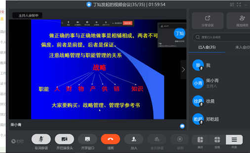 刘纪鹏院长和杨杰副院长高度重视第一周的线上授课情况,在授课前多次通过在线会议及微信等多种方式要求授课教师提高思想认识,授课结束后多次询问授课教师及学生的授课感受。为了更好地保证线上课程的顺利进行,他们进入学习通系统随机听取了个别老师的课程,对老师们的课程大纲、教学内容、与学生的互动情况、线上课程的技术支持进行临时的督导检查。通过督导可见我院教师都高度重视此次教学模式的调整,为线上课程做了充足的准备,严格按照学校要求,丰富教学内容,规范教学大纲,与学生积极互动交流,运用多种在线互动学习手段,保证凤凰彩票