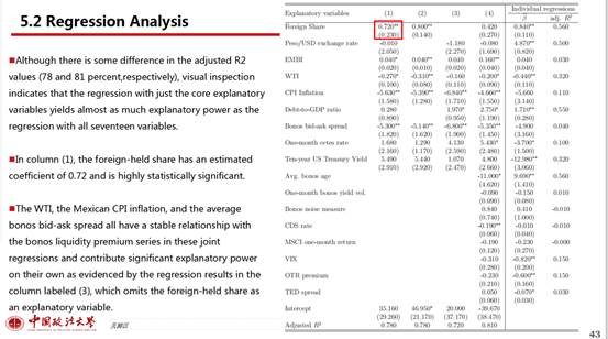 辛盛瑞同学为大家讲解了这篇论文的第五部分分析和估计墨西哥政府债券的流动性溢价和第六部分新冠期间墨西哥政府债券的流动性溢价分析。作者使用AFNS-L模型来计算债券市场的流动性溢价,首先计算出在没有金融摩擦的市场中债券的估计价格,接下来估计了墨西哥固定收益政府债券的流动性溢价和债券市场的外国份额,发现债券的平均流动性溢价和外国份额之间存在高度正相关,流动性风险是墨西哥政府债券定价的重要组成部分。之后通过实证分析研究了外国持有的墨西哥债券市场份额在多大程度上可以解释债券流动性溢价的变化,因变量为流动性溢价,解释变量为外国持有墨西哥固定收益政府债券的份额,控制变量是会对债券市场流动性产生重要影响的8个因素,此外还加入了一些扩展控制变量。回归结果显示,外国持有墨西哥债券份额的增加与债券流动性溢价的变化之间呈显著正相关关系,外国份额增加1个百分点会使流动性溢价提高近0.75个基点;外国持股的大量增加对墨西哥债券市场流动性溢价的上升趋势起到了重要作用,并将其提高了0.3%。