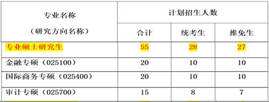 计划招收专业硕士研究生55人,其中推免生27名,统考生28名,如下表2所示(不包括MBA招生计划)。