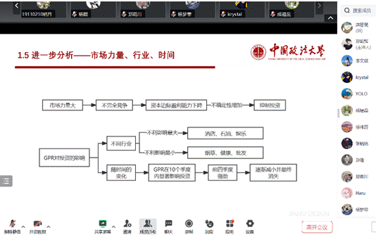 接下来,李文琪同学为大家讲解了论文的第六和第七部分。这两个部分重点探讨了市场力量以及其他因素对GPR-投资关系的影响。她指出,市场力量的大小会影响到企业在面临不确定性时的投资决策。当市场力量较大时,不完全竞争可能导致资本的边际盈利能力下降,从而进一步抑制企业的投资动机。此外,论文还从行业和时间两个维度分析了GPR影响投资的特点。李文琪发现,不同行业对GPR的敏感度存在显著差异,一些行业如酒店、石油、娱乐等受GPR的负面影响较大,而另一些行业如烟草、健康和批发等则受影响较小。从时间维度来看,GPR对投资的影响在前期较为强烈,但随着时间的推移和不确定性的解决,其影响会逐渐减弱并最终消失。