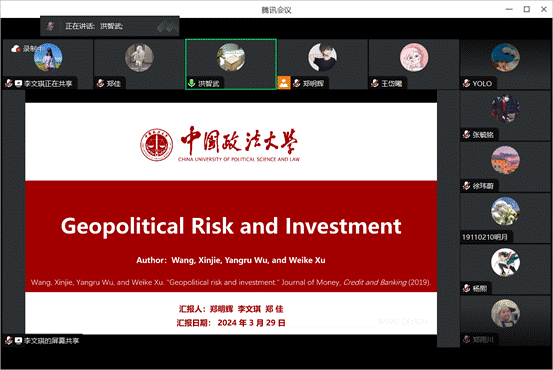 资本金融系春季学期第一次读书会在腾讯会议线上平台成功举办。本次读书会由洪智武老师指导,旨在通过深入研讨学术论文,增进同学们对地缘政治风险与投资关系的理解。参会人员包括洪智武老师、成福蕊老师以及23级资本金融系的学硕和专硕同学们。读书会选取了《地缘政治风险与投资》这篇论文作为本次研讨的主题,该论文由洪智武老师根据时事热点和学术前沿选定,以其高质量的研究内容和深刻的见解吸引了同学们的广泛关注。