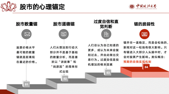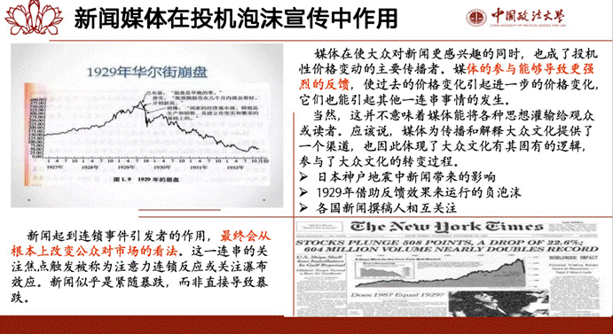 其次,王岱曦同学为大家介绍了书中结构性因素的背后还有哪些因素强化了泡沫的产生。首先就是文化因素。文化因素又可以具体分成两个部分:一个是新闻媒体对泡沫产生影响,即投机性泡沫的历史几乎是与报纸的产生同时开始的。虽然新闻媒体总是以市场事件的旁观者身份出现,其实媒体本身也是这些事件不可或缺的一部分。媒体的特性和新闻报道能够产生更强烈的反馈,使人们更多的关注表面新闻而更少的关注背后的机制,成为泡沫形成的助推;另一个是新时代的经济思想对泡沫产生影响。新时代经济思想即人们由于某些事物的产生而预期未来比过去前景更好或者不确定性更小,新时代的思想是能够产生投机性泡沫的反馈机制的一部分。其次是心理因素,可以分为股市的心理锚定、从众行为和思想传染两个部分。心理锚定又可以分为数量锚和道德锚,基于数量锚,人们通过量化指标判断股票定价,并调整投资行为。在道德锚下,投资者会考虑股市情感投入、直觉判断,并权衡财富和消费需求,做出投资决策。从众行为最典型的就是权威会对人的想法造成巨大影响,这种从众心理可能会导致人做出错误判断,再通过思想传染在整个社会蔓延,最终导致泡沫的产生。
