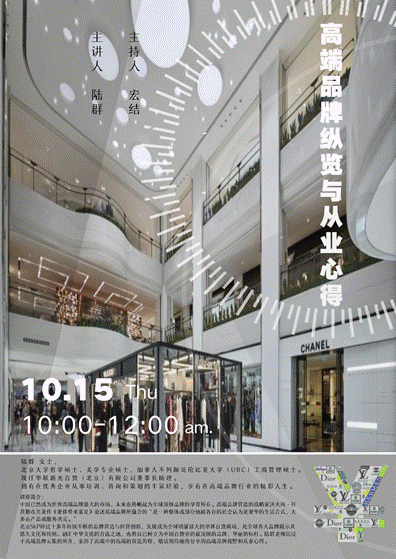 兼职教授陆群女士为我院2020级国际商务专硕(MIB)的同学们做《高端品牌纵览和从业心得》的讲座。讲座为MIB师生提供了与高端品牌营造领域的职场精英近距离接触的宝贵机会,是国际商务专硕培养践行跨理论实践的重要举措。国际商务专硕中心主任宏结教授,MIB导师陈曦副教授、梁涵副教授和张婷婷老师等参加此次讲座。