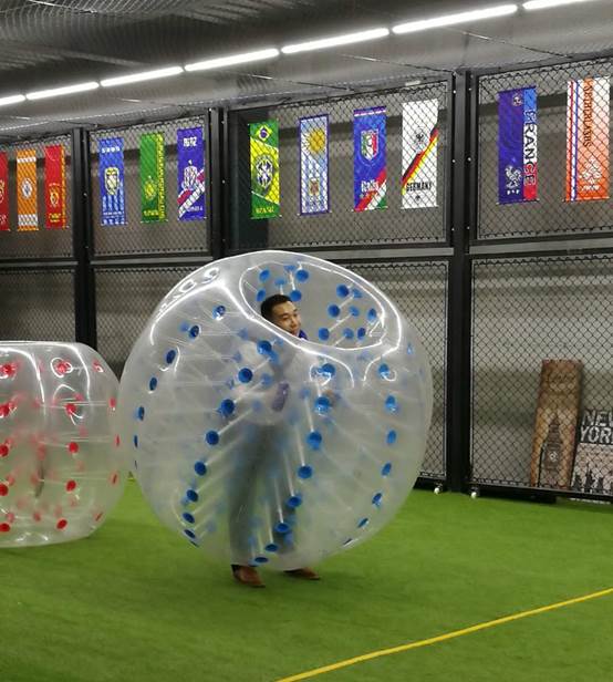 整体的参观之后,道境团队还带领学员们亲身体验了运动中心里的几个热门项目。学员们在路过泡泡足球场的时候,都被这一堆可爱的透明“泡泡”所吸引。教练见状,便指导大家开始了“热身”。学员们自告奋勇钻入泡泡球当中,开始进行“开心对对碰”。在教练的指导下,看似瘦弱的队员也可以撞倒体型庞大的壮汉,原来,除了体重,速度和平衡性也是碰撞后屹立不倒的关键因素,高中物理的“动量守恒定律”此刻有了形象化的展示。馆长在一旁介绍,这个运动项目是孩子们最喜欢的项目之一,除了极强的娱乐性之外,还可以锻炼孩子们的平衡性和爆发力,以及勇于进行“身体对抗”的竞争心理。