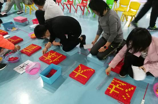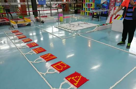 现场学员们在教练团队的指导下,有条不紊地搭建着自己的任务,小心再小心,谨慎再谨慎。经过半个多小时的努力,终于大功告成,排列整齐的多米诺骨牌,一个接着一个,穿过“法大体育产业MBA”几个大字,最终通向2022北京冬奥会的会徽标志。