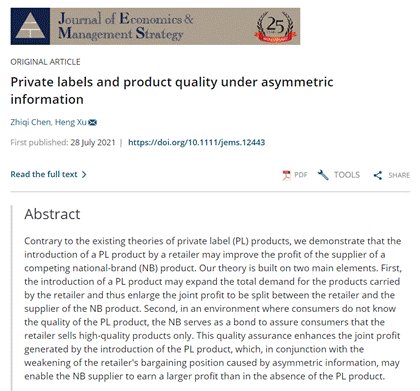 近期,我院法商管理系教师许恒以通讯作者身份在期刊《Journal of Economics & Management Strategy》在线发表题为《Private Labels and Product Quality under Asymmetric Information》的学术论文。该研究探索了在信息不对称环境下零售商推广自有品牌商品的动机,不同于传统理论研究,本文指出在信息不对称环境下零售商的自有品牌策略能够同时提升零售商与其不完全替代产品供应商的利润,本研究对零售商的自有品牌战略和供应商的应对策略提供了重要的理论支撑和实践路径。此前,许恒分别在《管理世界》、《教育研究》、《数量经济技术经济研究》等期刊发表重要成果。