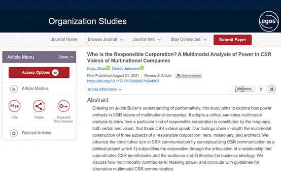 2.Kaiyu Shao*, Maddy Janssens. Who is the Responsible Corporation? A Multimodal Analysis of Power in CSR Videos of Multinational Companies. Organization Studies, 2021, //doi.org/10.1177/01708406211044891.